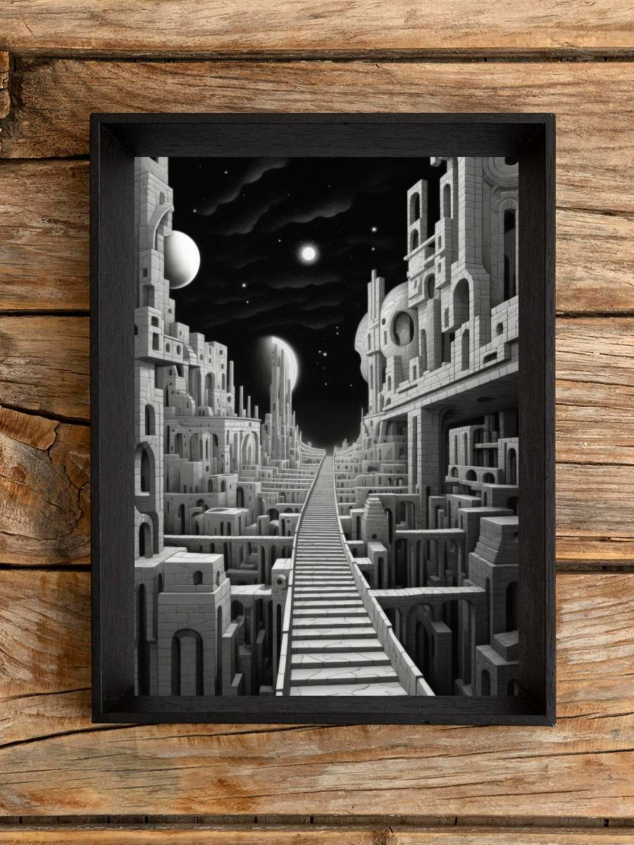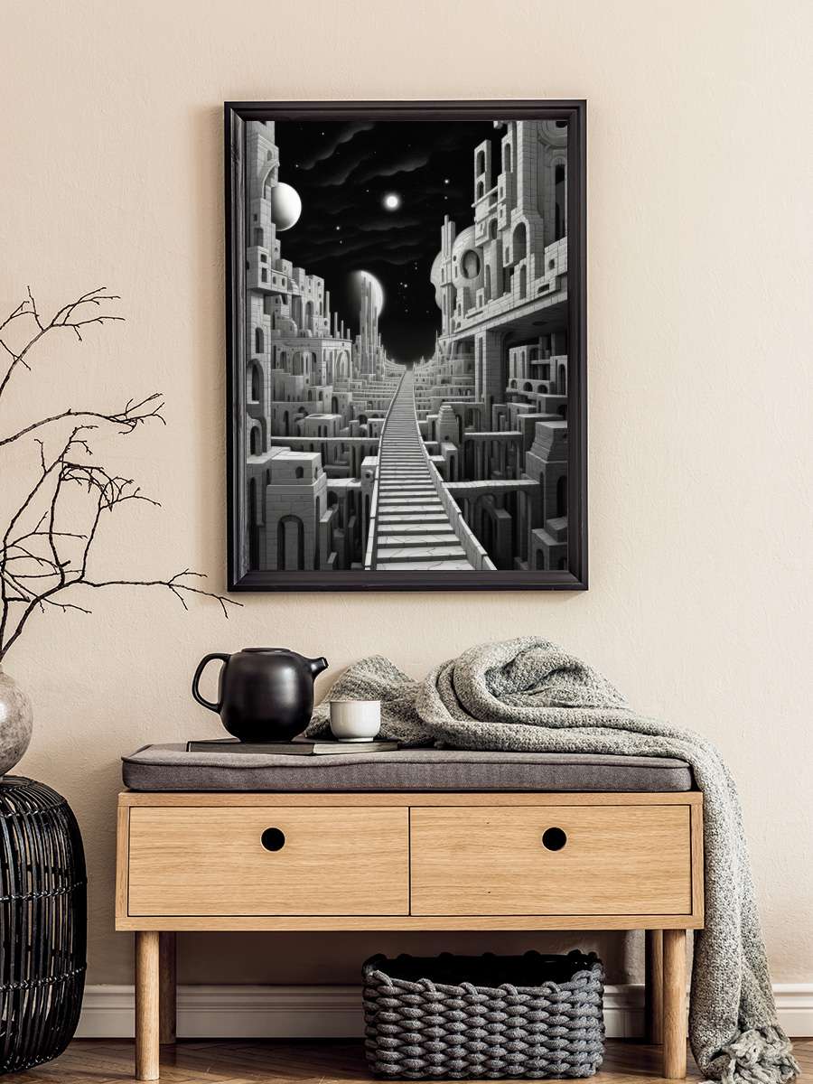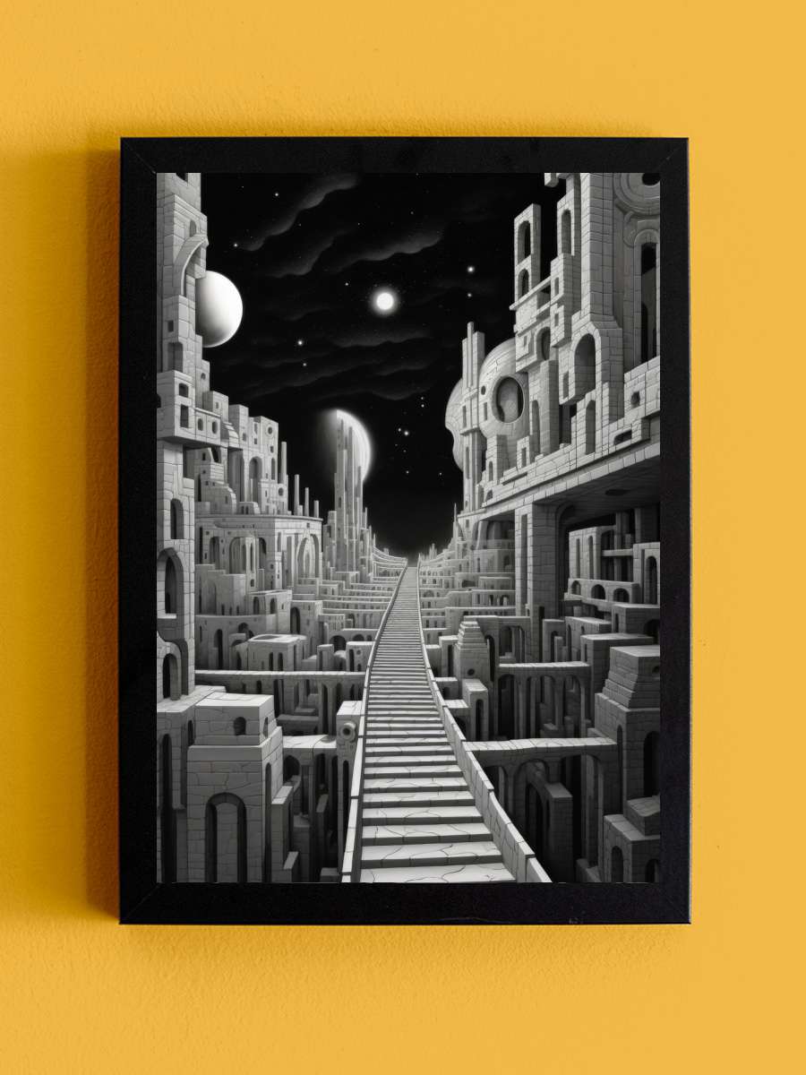 Escer Style Moon City Surreal Sanatsal Modern Tablo Siyah Çerçeveli Poster Modern Duvar Tablo