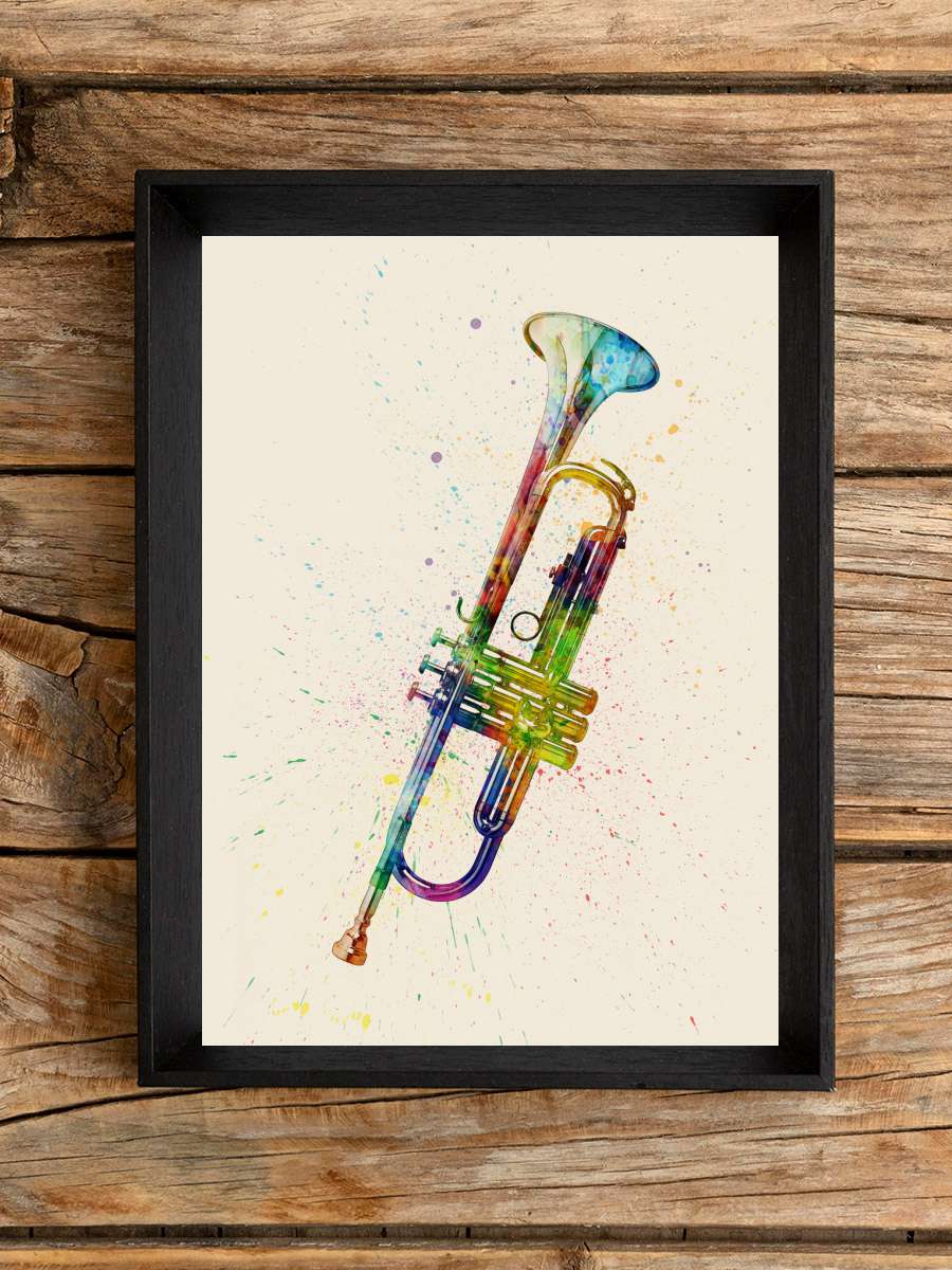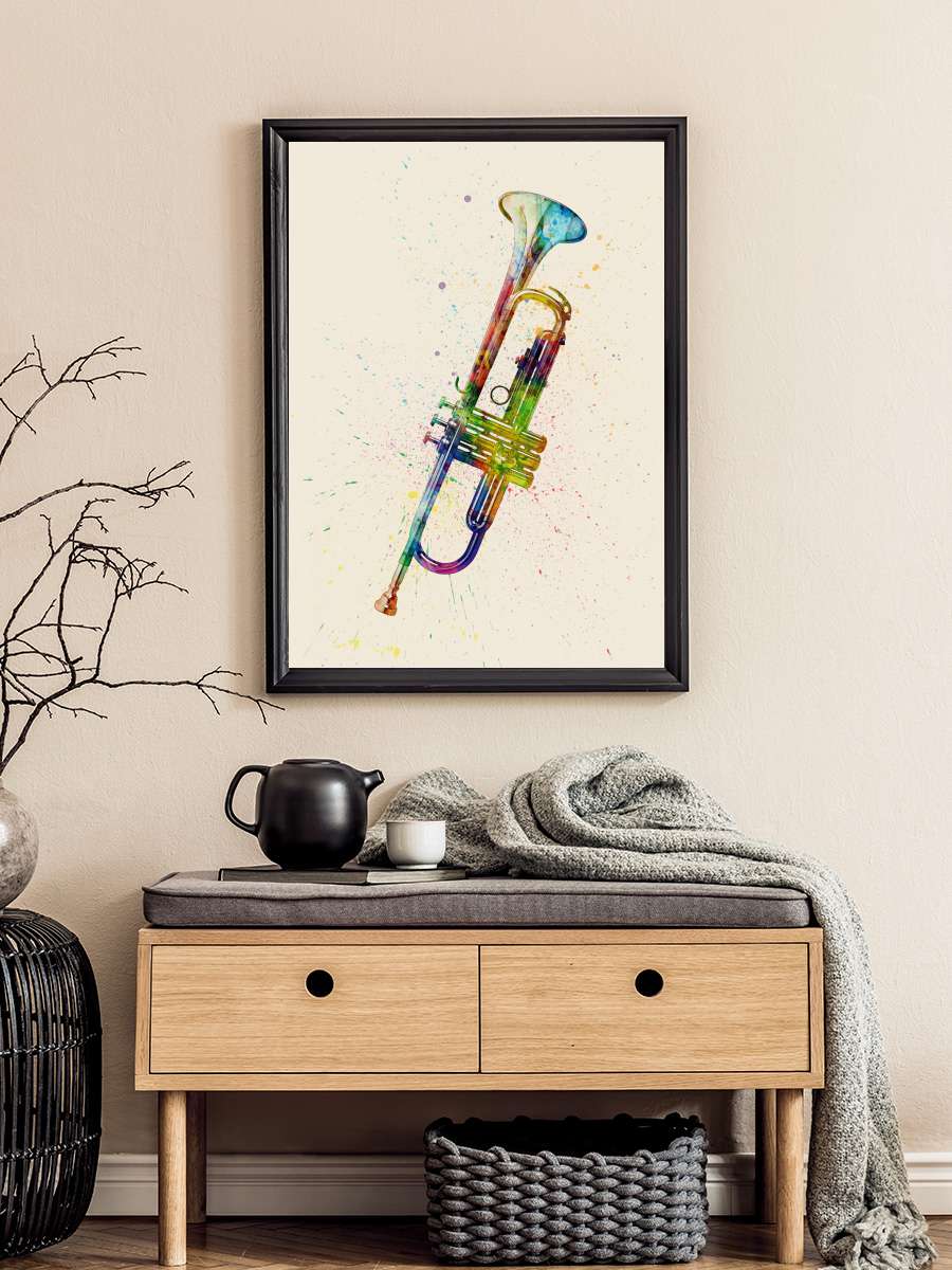 Trumpet Abstract Watercolor Müzik Poster Tablo Siyah Çerçeveli Yüksek Kalite Müzik Duvar Tablo